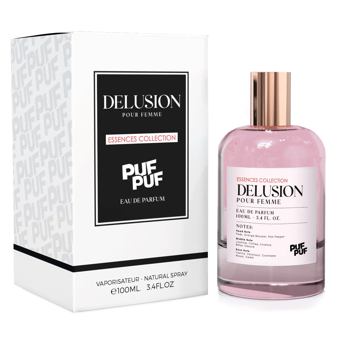 Note de varf: Pere, Floare de Portocal, Piper Roz Note de mijloc: Iasomie, Cafea, Licorice, Migdale Amare Note de baza: Vanilie, Patchouli, Lemn de Casmir, Lemn de Cedru Delusion de la PufPuf – O Fantezie Olfactivă Plină de Farmec și Mister Delusion este parfumul care îmbină subtilitatea cu intensitatea, creând o fantezie olfactivă captivantă, ce te poartă într-o lume de rafinament și seducție. Conceput pentru cei care își doresc să își exprime latura sofisticată și enigmatică, acest parfum este o călătorie senzuală spre neexplorat. În deschiderea sa, combinația de pere suculente, floare de portocal delicată și piper roz picant creează o impresie vibrantă și energizantă, un început dulce-amărui, care stârnește curiozitatea. Inima parfumului dezvăluie o complexitate unică, cu iasomia elegantă, cafeaua profundă și licorice-ul exotic, toate învăluite de migdale amare, care adaugă o notă misterioasă și sofisticată. Baza parfumului este un amestec rafinat de vanilie caldă, patchouli pământiu, lemn de casmir cremos și lemn de cedru lemnos. Împreună, aceste note lasă o urmă senzuală și plină de caracter, care persistă și seduce. Delusion de la PufPuf este mai mult decât un parfum – este o provocare pentru simțuri, o fantezie olfactivă care provoacă și fascinează în același timp. Ideal pentru momentele în care vrei să lași o impresie de neuitat și să te îmbraci în mister și farmec.
